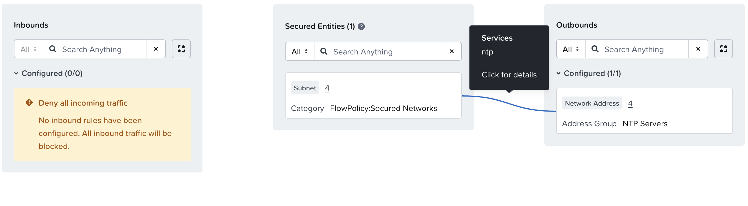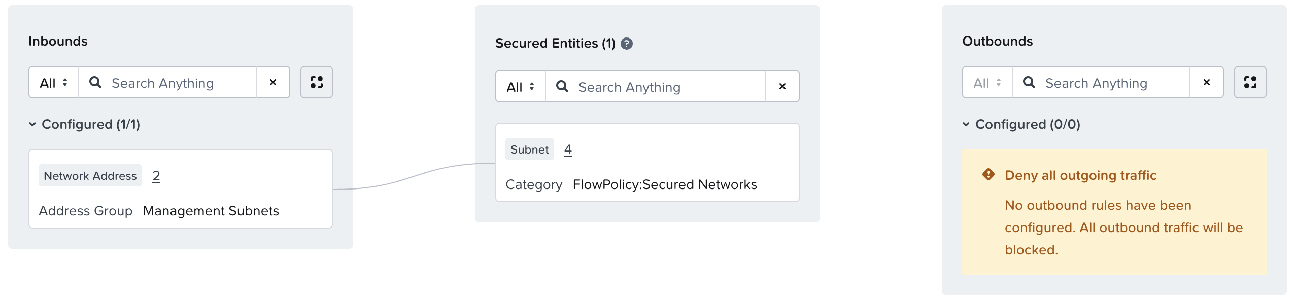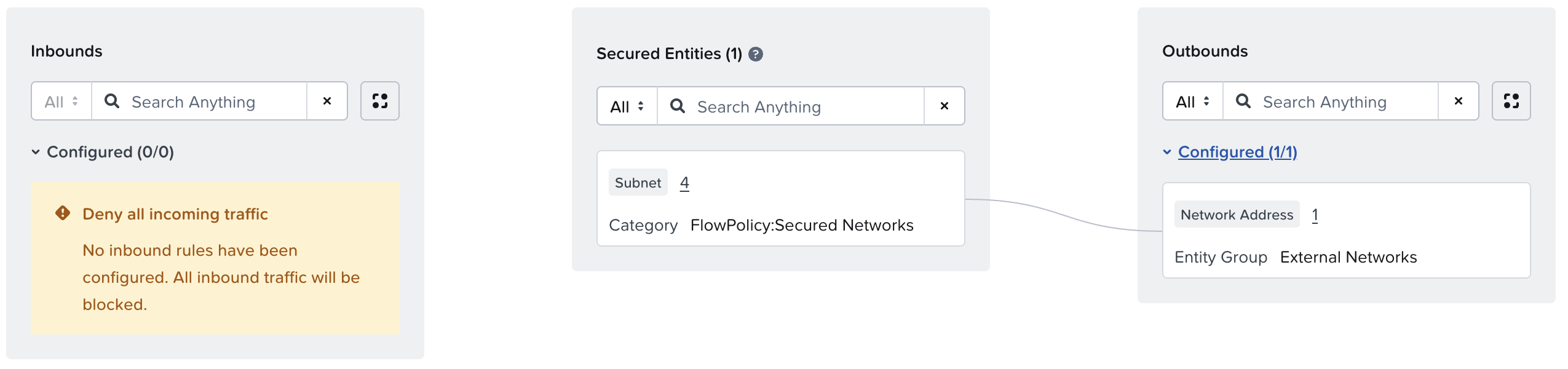 Finally, we can implement our “Deny by Default” by creating a policy for our secured networks with no defined inbounds or outbounds. This ensures that any workloads on our networks are considered secured by FNS, and thus will only be allowed to send/receive traffic defined in specific application policies.