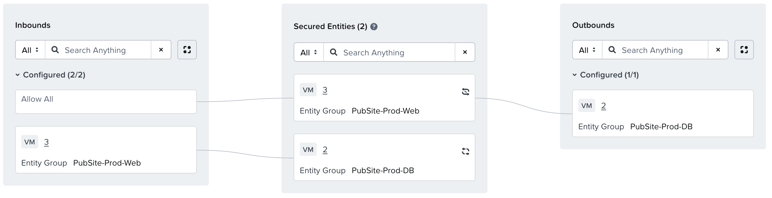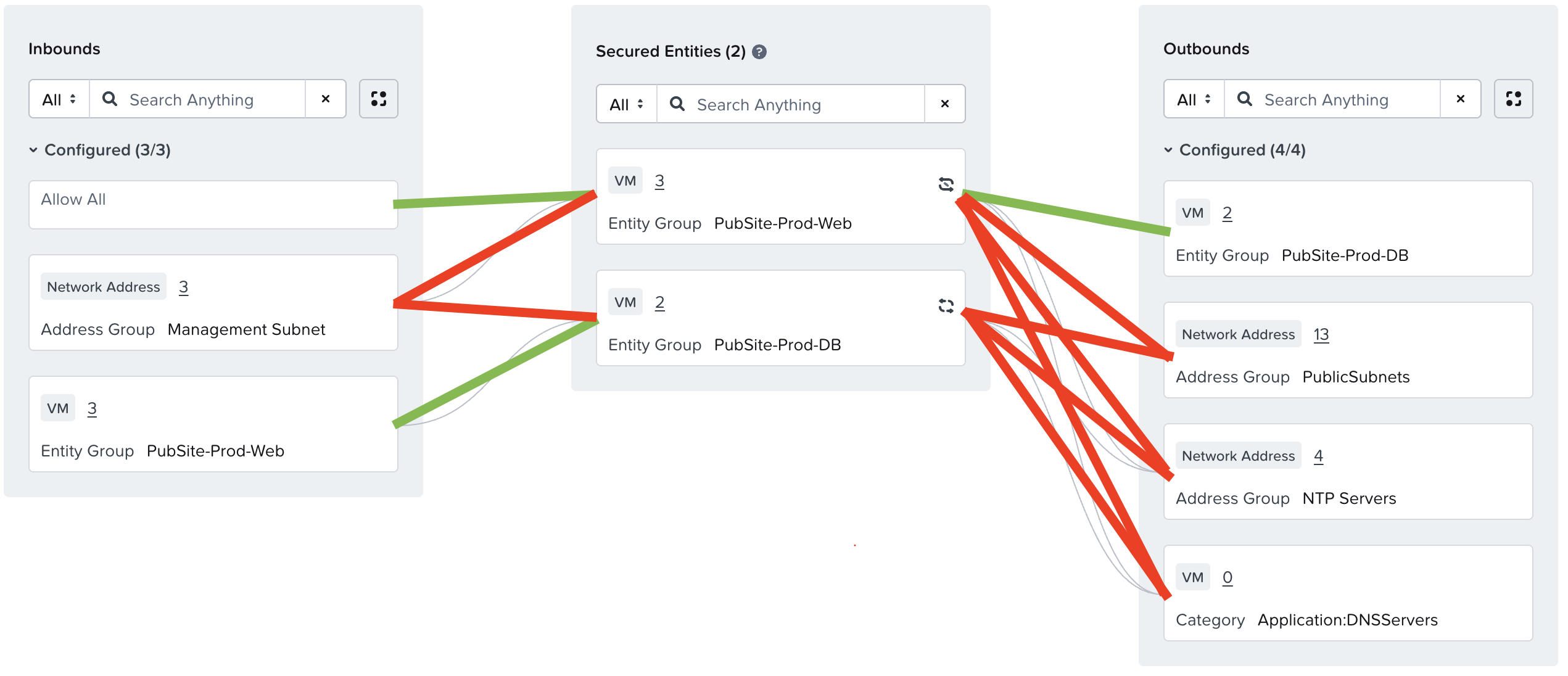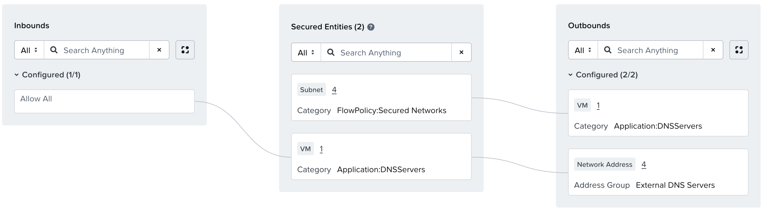 Finally, we can implement our “Deny by Default” by creating a policy for our secured networks with no defined inbounds or outbounds. This ensures that any workloads on our networks are considered secured by FNS, and thus will only be allowed to send/receive traffic defined in specific application policies.
