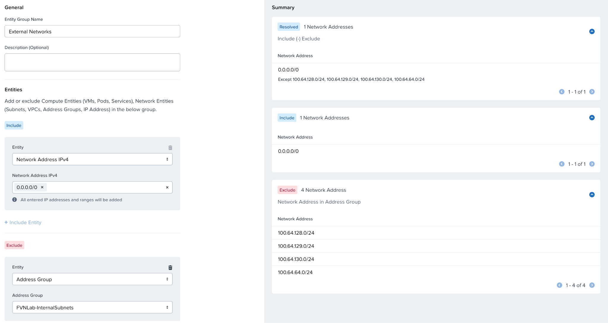 We can create our policy for Internet Access as well. Previously, we used a Public Subnets address group that defined 13 address blocks, and that’s still a perfectly valid. However, we also have another new option, Network Exclusions. We can create an Entity Group that is defined as 0.0.0.0/0. We can then define an Exclusion for an address group that defines our internal subnets (whether they be Flow Overlay subnets or other networks used throughout our organization. This will effectively result in a group that defines every network other than our own. We could use this as our destination, with the assumption that any traffic destined for this group would end up at our perimeter firewall and be policed there.