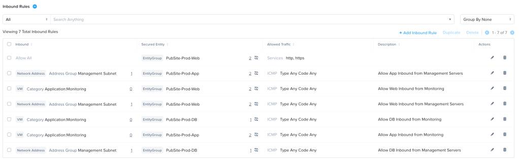 We can then add the inbounds and outbounds that we know about. We can add our Application:Monitoring category and our Management Subnet address group as Inbound Sources, and our Application:Logging category and DNS Serversand NTP Servers address groups as Outbound Destinations. We can then build our Inbound and Outbound rules. If we know what traffic should be allowed for those rules, (such as our DNS and NTP traffic), we can specify it. If we don’t, we can set the rule to what we think might be required (for instance, allowing syslog traffic to our logging servers), or something we can use temporarily, like enabling ICMP, and our Monitor policy will let us know that there is traffic that would be blocked, alerting us to update the rule. Finally, we know that our web servers accept inbound traffic on HTTP and HTTPS from anywhere, so we can add Allow All as an Inbound Source, with a rule allowing that traffic to our Web servers.