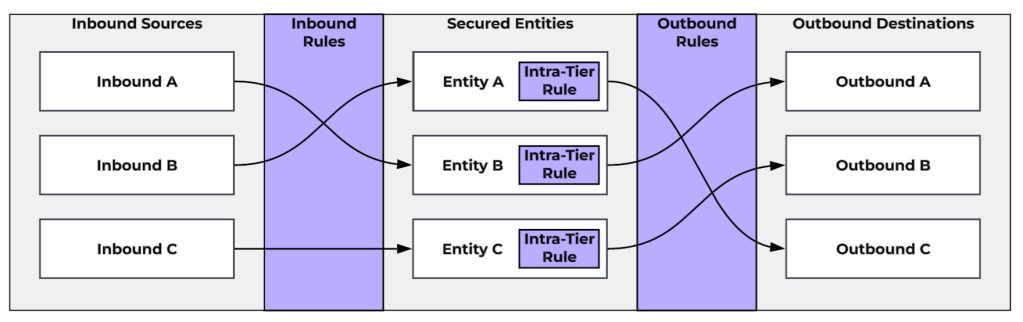 Finally, the policy is composed of Inbound Rules, which are mappings of an Inbound Source to a Secured Entity with the list of allowed ports and protocols, as well as Outbound Rules, which are mappings of a Secured Entity to an Outbound Destination, with the list of allowed ports and protocols.