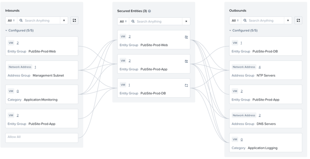 A policy also includes lists of Inbound Sources and Outbound Destinations. These can be either VMs, Subnets3, VPCs4, Entity Groups, Address Groups, Network Addresses (ad hoc/one-off addresses that don’t necessarily require creation of a reusable Address Group) or Allow All (meaning all IPs).