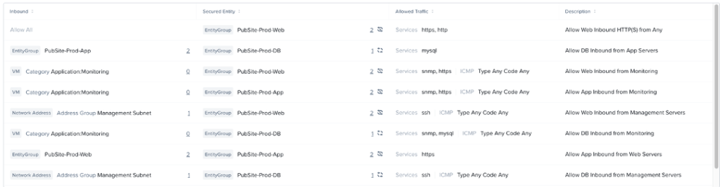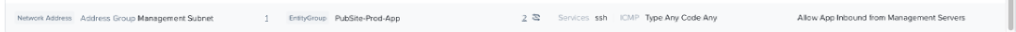 We see similar flows showing traffic between Web and App on TCP-443, so we’ll add PubSite-Prod-Web as an Inbound Source for PubSite-Prod-App, and PubSite-Prod-App as an Outbound Destination for PubSite-Prod-Web, both allowing the HTTPS service.