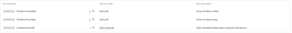 We can create an application policy called PubSite-Production, and we’ll fill in what we know. We’ll define our Secured Entities, which would be our PubSite-Prod-Web, PubSite-Prod-App, and PubSite-Prod-DB entity groups. When defining those entities, we need to assign the Intra-Tier Rule for each. If we know, for instance, whether our web servers need to communicate, we can define that traffic. For now, let’s assume we don’t know whether this is needed for our tiers, so let’s set all three entities to Deny All Traffic for now.