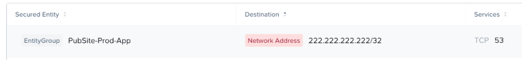 In Enforce mode, we get similar visualizations for blocked traffic as we do for observed traffic in Monitor mode. If during testing, issues arise, we can refer to the visualization to see if there is additional traffic that was not added to the rule. Additionally, we can quickly look at a policy to see if there is unexpected traffic that might indicate an issue or misconfiguration on a server. For example, below we see that one of our App servers has tried to communicate with an unexpected IP on the DNS port TCP-53: