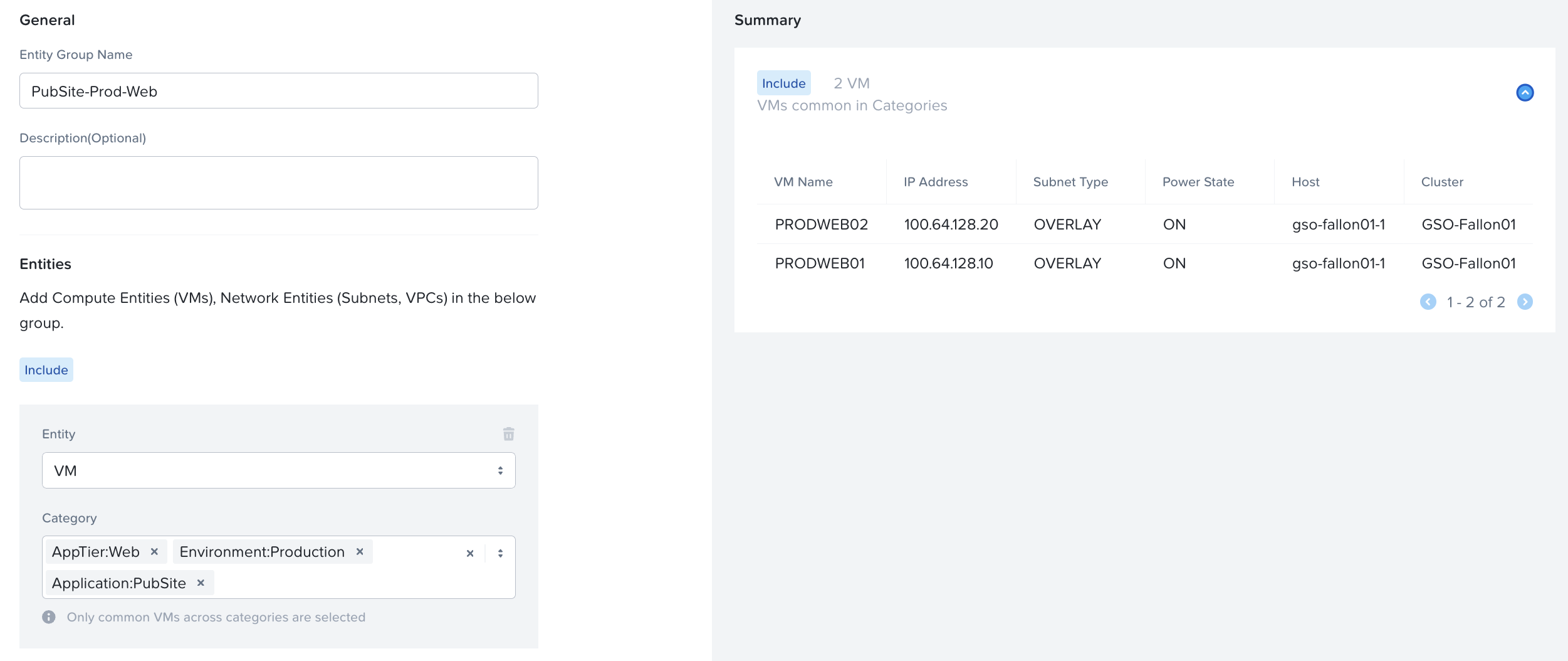 Next, we can create Entity Groups that will help us target specific the specific servers. Entity Groups are new constructs that allow us to filter to VMs that match multiple categories. For instance, we can create an Entity Group called PubSite-Prod-Web based on the categories Application:PubSite, Environment:Production, and AppTier:Web. This will allow us to specifically target our PRODWEB01 and PRODWEB02 servers, as well as ensuring that any future servers assigned those three categories will automatically be included in our group and policy.
