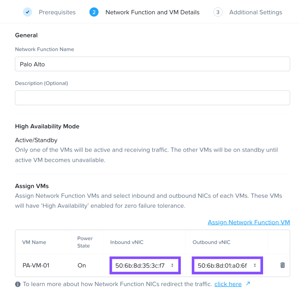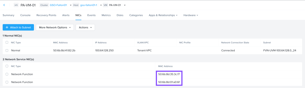 Once the VM is built, we should be able to identify the MAC addresses assigned to the Network Function NICs from the VM info in Prism Central.