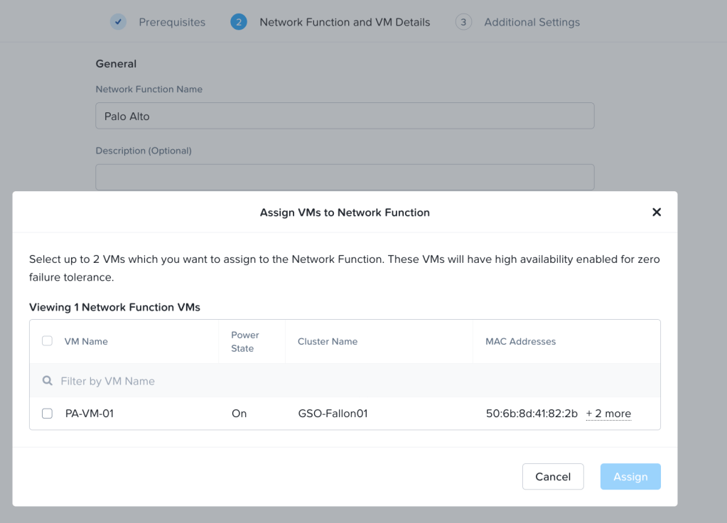 We can then create a Network Function VM from the Network Function tab of the Prism Central Security Policies section. We will select our PA VM and make sure the correct MACs are set as Inbound and Outbound