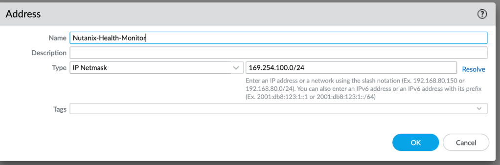 We will also need to create a security policy that allows health checks for the Network Function service. These health checks use pings to and from a 169.254.100.0/24 address, so we will create a network address object.