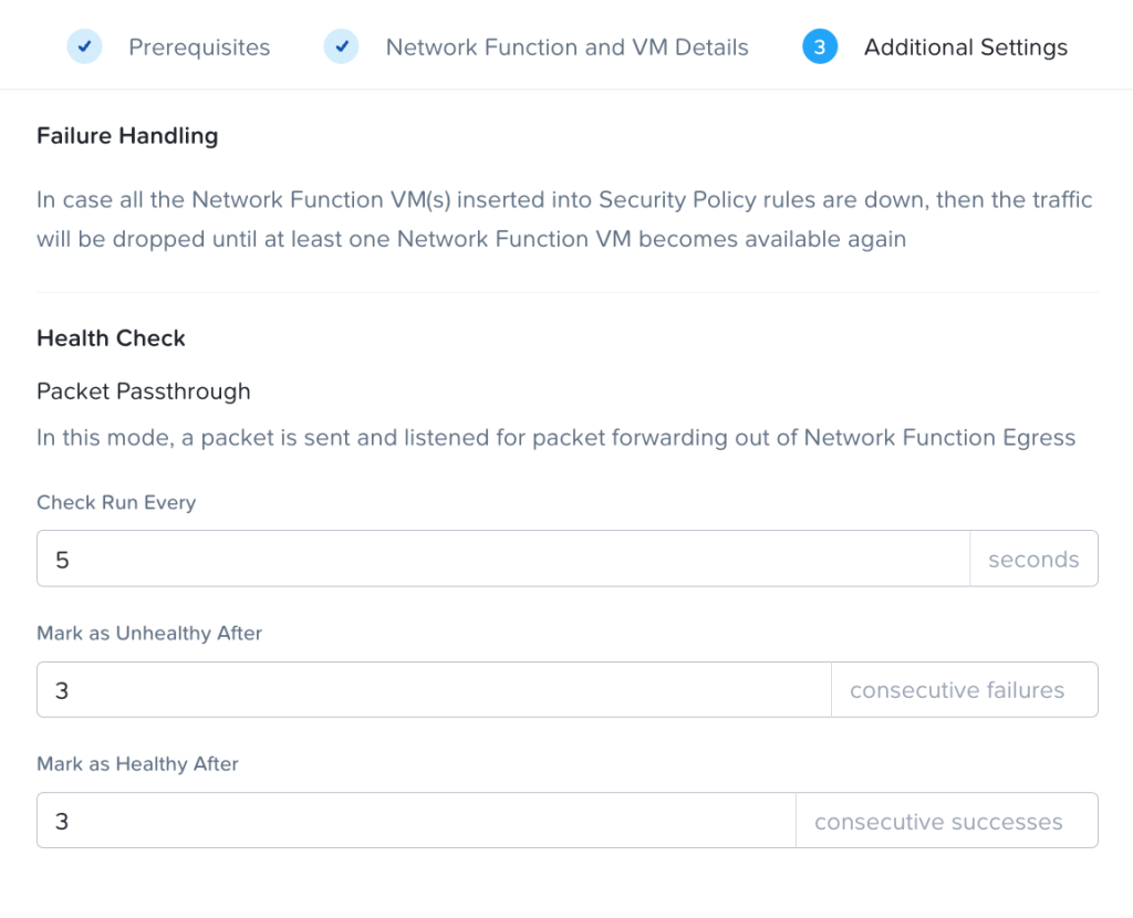 Configure health check values. In this case, health checks will be sent every 5 seconds, and it will take 3 missed or successful checks to change the network function VM’s health.