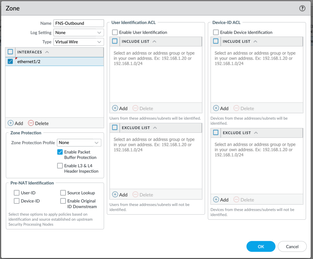 We will create two Virtual Wire security zones, FNS-Inbound and FNS-Outbound, and assign the appropriate interface to each.