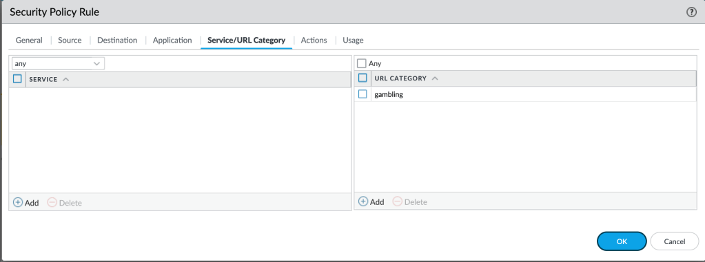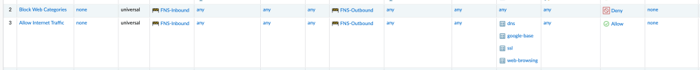In our Palo Alto, we can create a security policy to secure this traffic. We’ll configure it to allow standard web browsing, access to Google, as well as DNS. We’ll also configure a higher priority policy that specifically blocks traffic to websites that fall under the Gambling category.