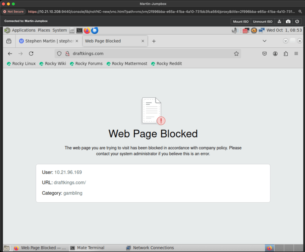 Once we commit our policy, we can test. We load up our jump box, and verify we can access the internet, and sure enough, we can. And to further confirm, we attempt to load a gambling website. Sure enough, we cannot!