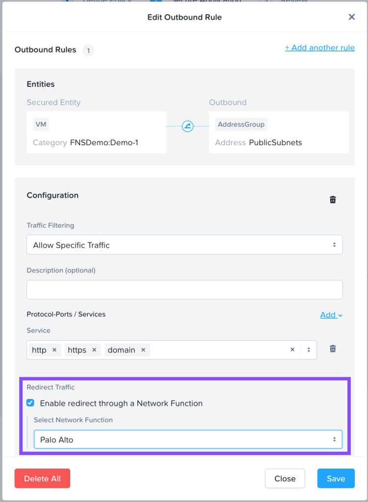 To demonstrate the Service Insertion feature, we will use Palo to inspect internet traffic and block undesired web traffic. While one might typically do this organizationally from a perimeter firewall, it’s the easiest way to demonstrate the feature. Within an Application Policy, we can add an outbound rule to allow HTTP, HTTPS, and DNS traffic to a Public Subnets address group and choose to redirect this traffic through our network function. We’ll use the category FNSDemo:Demo-1 as our source, which includes a single VM we’ll use for testing.