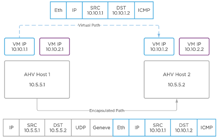 Flow leverages Geneve network encapsulation to provide Overlay networking allowing for creation of layer-2 segments without any changes to the underlay network. Each brAtlas bridge (and therefore each host) acts as a Geneve TEP. When two VMs on different hosts need to communicate, the host and bridge at the source will encapsulate the packet with Geneve, and the host and bridge at the destination will decapsulate and deliver it.
