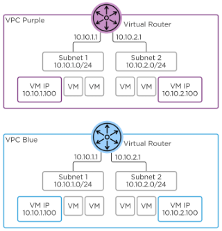As VPCs are isolated routing spaces, IP addresses can be overlap between VPCs, with NAT being used to facilitate communication between VPCs when IP overlap would otherwise prevent it.